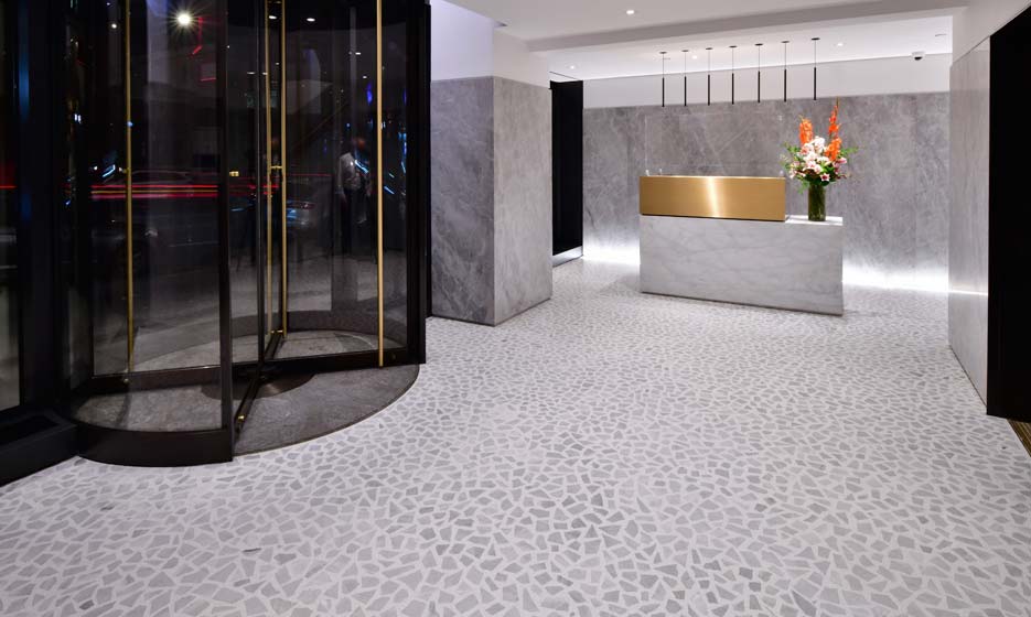 Elegant and timeless, with endless design possibilities, Terrazzo has proven to endure and perform for more than 500 years. Today’s terrazzo is an environmentally friendly material with optimum durability and low maintenance. Terrazzo can consist of marble, quartz, granite aggregate, mother-of-pearl and/or pre-consumer and post-consumer recycled glass, porcelain and mirror chips, which are mixed with cement or epoxy and polished to produce a smooth, uniformly textured surface for floors, walls, stairs, curbs, counter-tops and even ceilings.