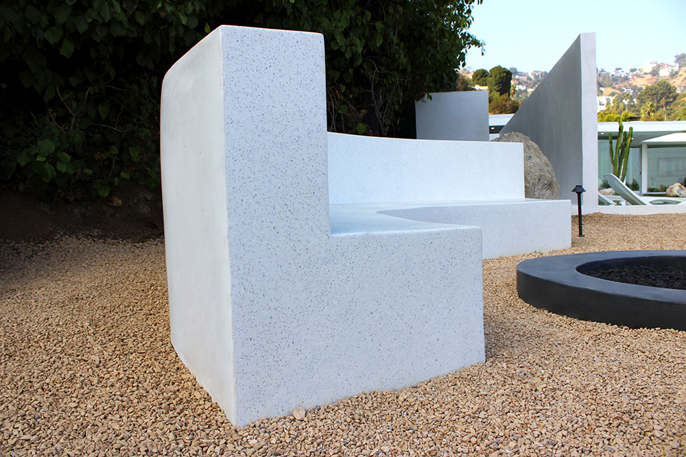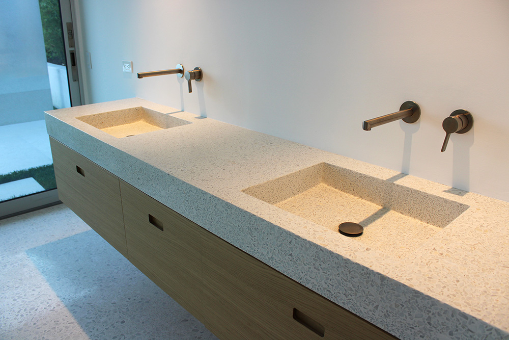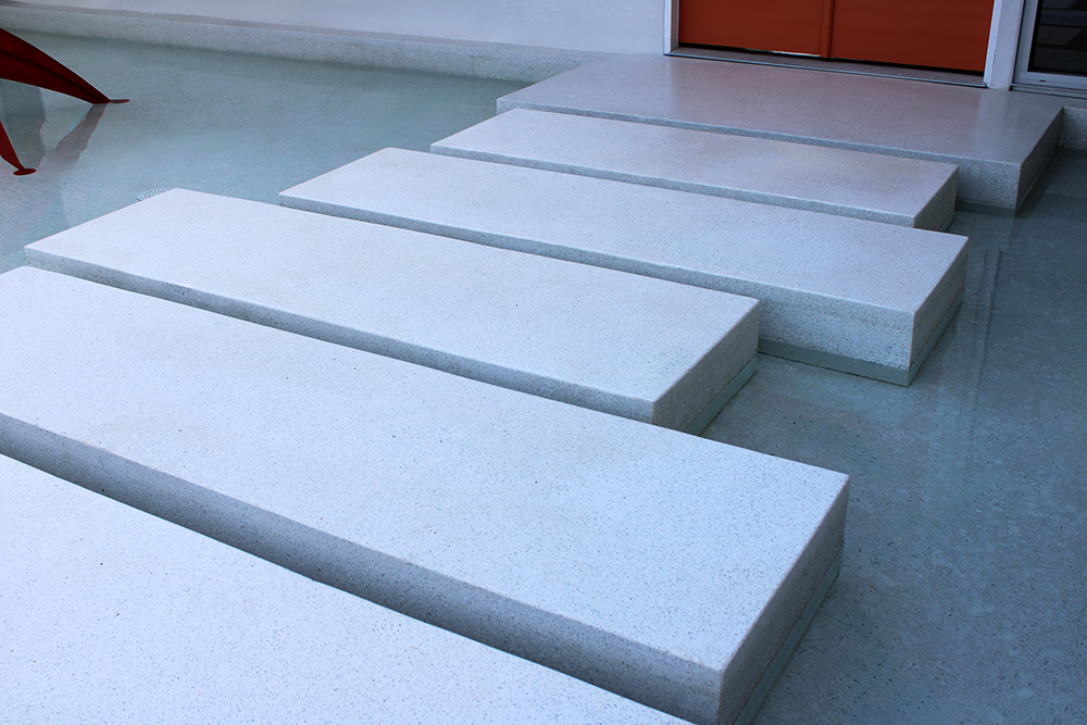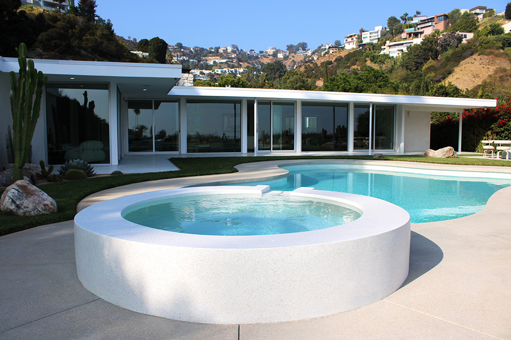 The Venetian terrazzo mix, a traditional style incorporating larger-than-standard aggregates (sizes 4–7), introduces texture and visual depth while maintaining a clean, monochromatic finish. Terrazzo flows throughout the interior living areas and extends to the outdoor pool terrace, where a sculptural hot tub and cascading waterfall form the heart of the home’s outdoor experience.