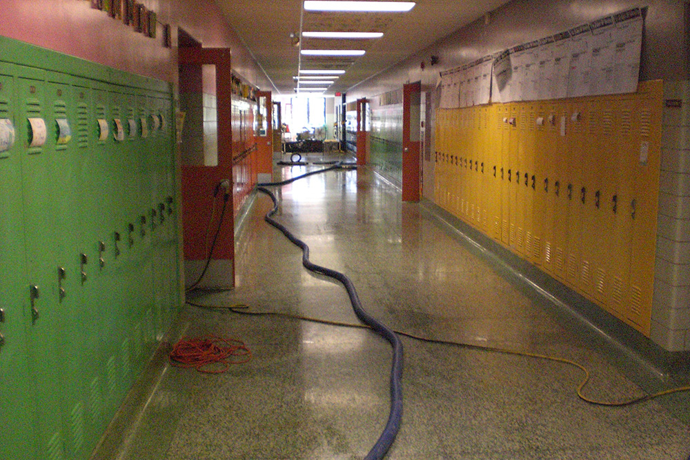 The school’s floors were submerged under just half an inch of water, but it was enough to cause the original asbestos tiles throughout the building to delaminate. One finish that emerged from the flood intact, however, was the original 61-year-old terrazzo in the corridors.